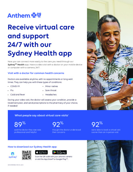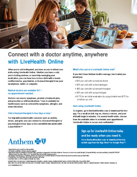 When you’re not feeling well, you have access to virtual care visits using LiveHealth Online. Whether you have a cold, you’re feeling anxious, or need help managing your medication, you can have face-to-face visits with a board-certified doctor, psychiatrist, or licensed therapist from your smartphone, tablet, or computer.